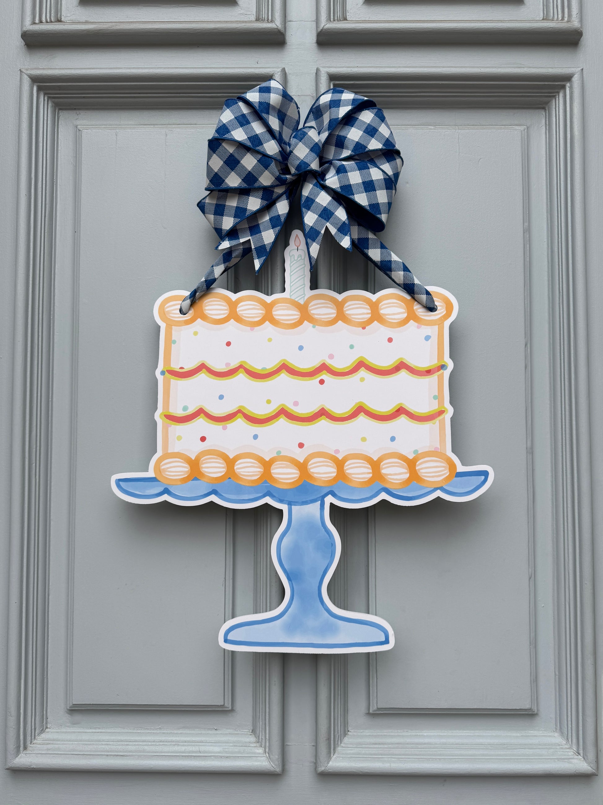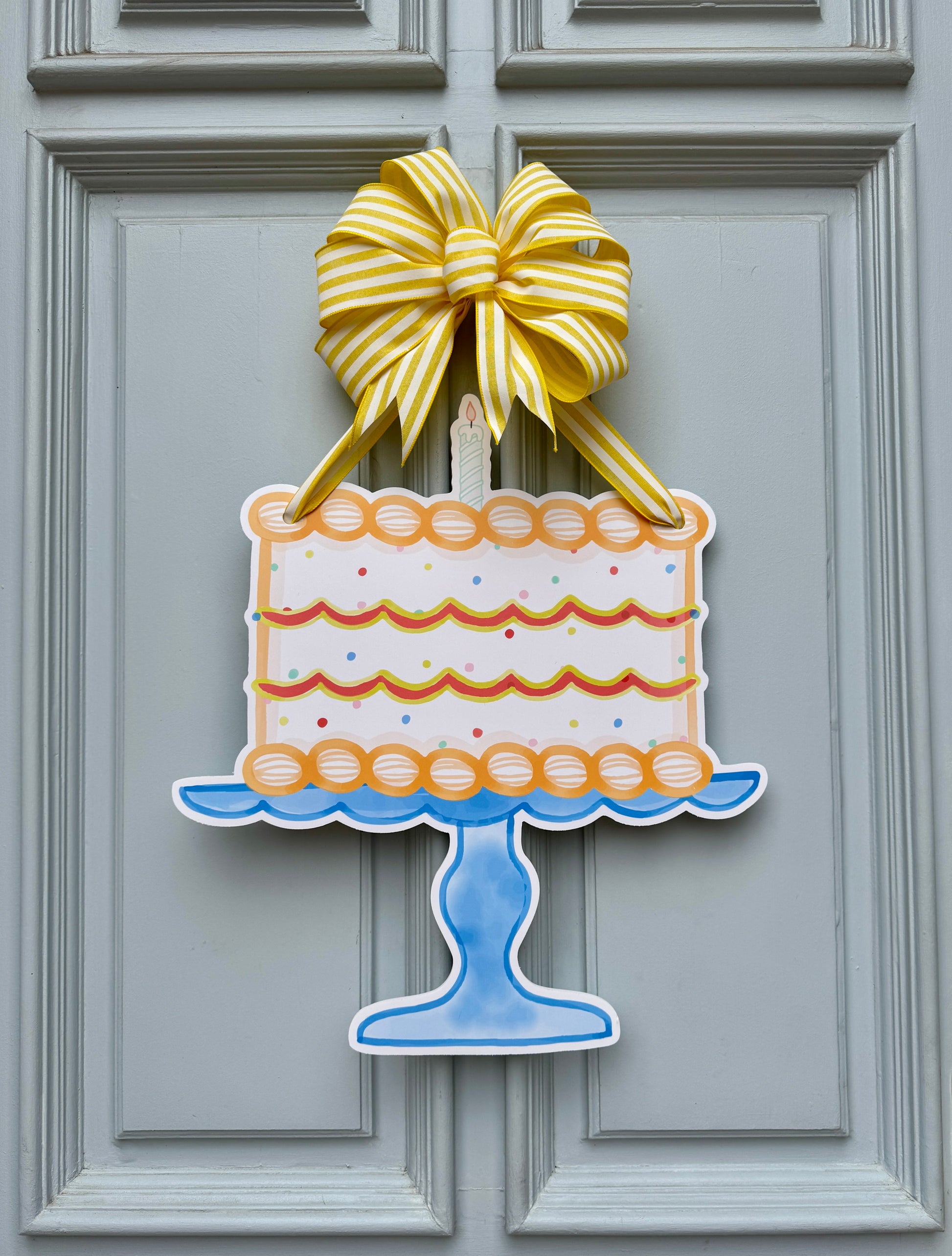 Our high-quality Birthday cake door hanger measures approximately 23” tall. Watercolor artwork is printed on a sturdy, lightweight 1/4 thick weather resistant PVC material. Our signs feature vibrant, fade resistant artwork that is made to last year after year.