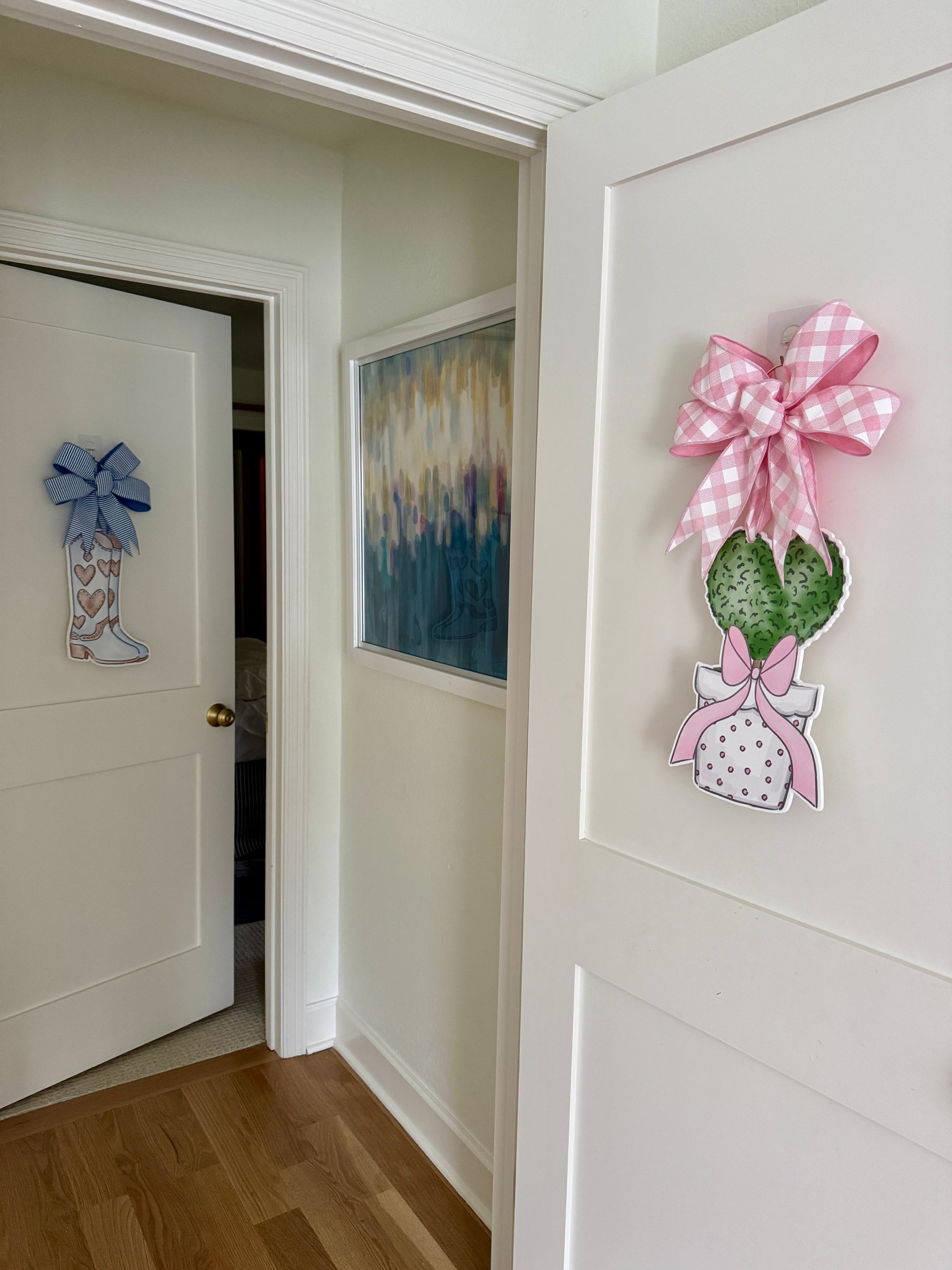 Each door hanger includes a custom handmade bow, allowing you to personalize it to match your style, theme, or decor perfectly.